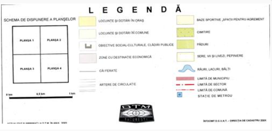The Topographic Plan of Bucharest at a 1:15,000 scale was created based on topographic maps at scales of 1:5,000 and 1:10,000 through cartographic generalization. The plan consists of four sheets, each measuring 80 x 76 cm. The representation of the entire city, along with its suburban communes and villages, on a minimal number of sheets allows for an assembly of convenient dimensions, suitable for the overall study of the city, its expansion areas, and recreational zones. The generalized depiction of residential buildings and industrial areas, highlighted with soft contrasting colors, ensures high expressiveness and an aesthetically pleasing graphic appearance.